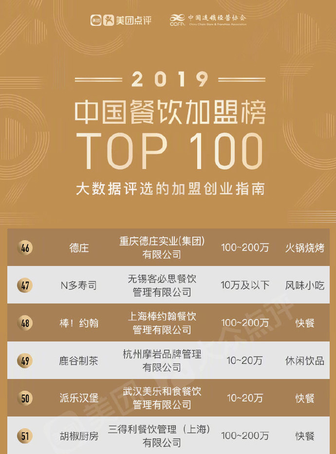 美团点评联合中国连锁经营协会正式发布“2019中国餐饮加盟榜TOP100”!